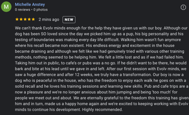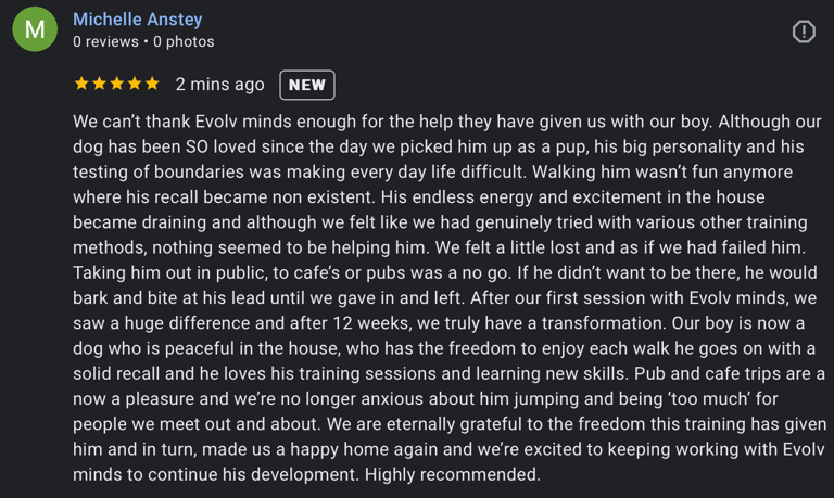 Our dog's transformation was incredible! Evolv Minds' approach is truly effective and worth every penny.